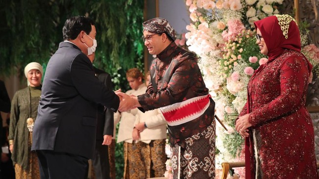 Menteri Pertahanan sekaligus Ketua Umum Partai Gerindra Prabowo Subianto menghadiri resepsi pernikahan putri Gubernur DKI Jakarta Anies Baswedan, Mutiara Annisa Baswedan, dengan Ali Saleh Alhuraiby. Prabowo tampak bersalaman dengan Anies.