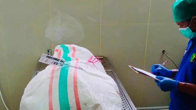 Korban memakai kaus tanpa lengan berwarna merah dan celana bahan berwarna biru. Ada tali tambang kuning, karet ban, dan tali rafia yang diduga untuk mengikat karung.
