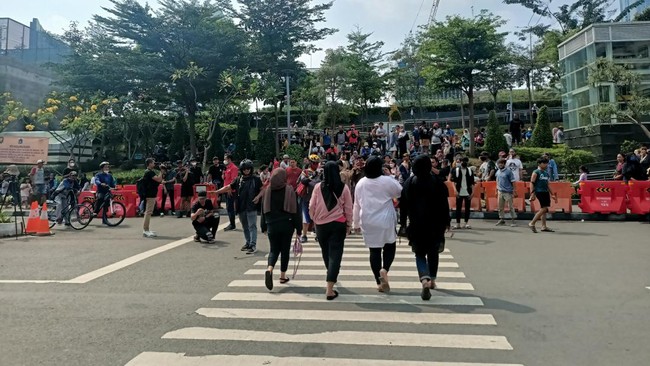 Petugas mengimbau warga yang nongkrong di trotoar agar tidak berkerumun. Suasana di sekitar lokasi pagi ini terpantau ramai warga yang asyik berswafoto di sejumlah titik di Dukuh Atas.