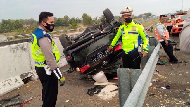 Mobil Avanza langsung terbalik di jalan tol setelah menabrak median jalan. Kecelakaan tunggal ini mengakibatkan sopir dan penumpang minibus tersebut terluka. Semua korban telah dievakuasi ke RSUD Jombang.