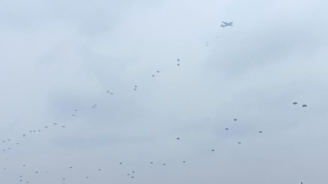 Pantauan di lokasi, terjun payung dilakukan tiga sesi. Pertama, pada pukul 10.27 WIB; kedua, pada pukul 10.37 WIB; dan yang terakhir pukul 10.43 WIB. Terlihat di sana ratusan penerjun mendarat di kawasan drop zone.