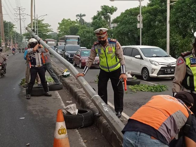 Tiang penerangan jalan umum (PJU) di Bekasi Timur, Bekasi, roboh akibat tertabrak truk. Tiang PJU itu sempat rebah ke jalanan hingga berdampak pada kondisi lalu lintas.