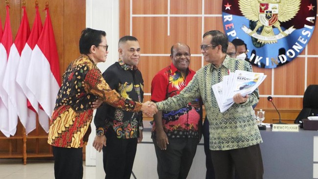 Amnesty International Indonesia bersama Majelis Rakyat Papua (MRP) menemui Menko Polhukam Mahfud Md di Kantor Kemenko Polhukam, Jakarta Pusat, siang tadi. Mereka menyerahkan keputusan kultural MRP sepanjang 2021-2022.