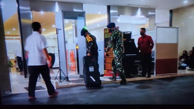 Saat menggiring koper tersebut, dua personel Brimob itu terlihat diperiksa petugas pemeriksa gedung.