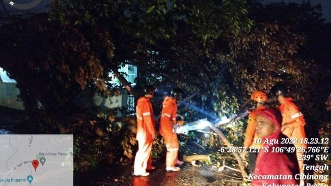 "Pohon tumbang di Jalan Tegar Beriman, titiknya 2 pohon tumbang di dekat gedung PDIP, 1 Pohon di SPBU, 1 pohon di dekat kantor BPN (Badan Pertanahan Nasional), 1 pohon dekat Kodim," kata Kabid Kedaruratan dan Logistik Badan Penanggulangan Bencana Daerah (BPBD) Kabupaten Bogor Mohammad Adam, Rabu (10/8/2022) malam.