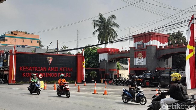 Pantauan detikcom di sekitar Mako Brimob, Kelapa Dua, Depok, Jumat (12/8/2022), tampak dua kendaraan taktis dan sembilan unit motor bersiaga di depan gerbang.