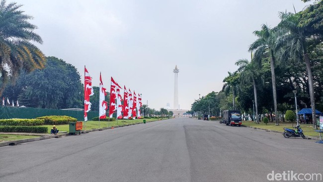 Pantauan di lokasi pukul 08.40 WIB, Selasa (16/8/2022), kawasan Monas tampak sepi. Mulai dari pagar masuk hingga di dalam kawasan Monas sudah terlihat bendera merah putih yang yang dipasang berjajar. Terlihat juga petugas tengah menyemprotkan disinfektan, dari gerbang depan hingga area dalam kawasan Monas. Di bagian luar Monas tampak beberapa warga tengah berolahraga.