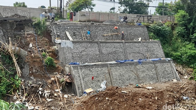 Pantauan detikcom di proyek pembangunan tembok antilongsor Cilebut di lokasi siang ini, tampak tembok penahan tanah sudah terpasang hingga hampir sejajar dengan Jl Raya Cilebut. Kondisi ini jauh berbeda dengan kondisi sebelumnya, ketika dinding yang dibangun masih separuh dari tinggi tebing. Di lokasi, beberapa pekerja juga tampak masih merapikan bagian tengah dinding tebing dengan semen.