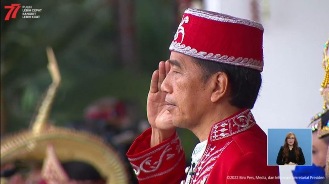 Jokowi kembali memakai baju adat dalam upacara HUT ke-77 RI. Jokowi mengenakan baju adat Dolomani dari Buton, Sulawesi Tenggara.