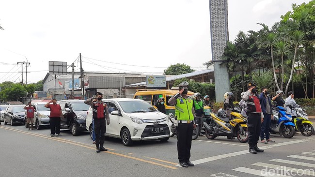 Pantauan detikcom di lokasi, Rabu (17/8/2022), pengendara berhenti dari tiga sisi jalan. Di setiap sisinya ada polisi yang bersiaga untuk menghentikan pengendara.