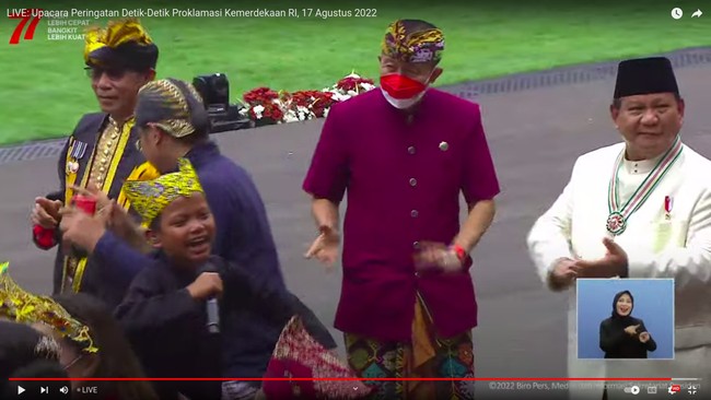 Farel Prayoga, penyanyi cilik yang viral di media sosial karena menyanyikan lagu 'Ojo Dibandingke', turut meriahkan upacara HUT ke-77 RI di Istana Merdeka. Farel membuat hadirin upacara bergoyang, tak terkecuali Ibu Negara Iriana Joko Widodo dan para menteri.