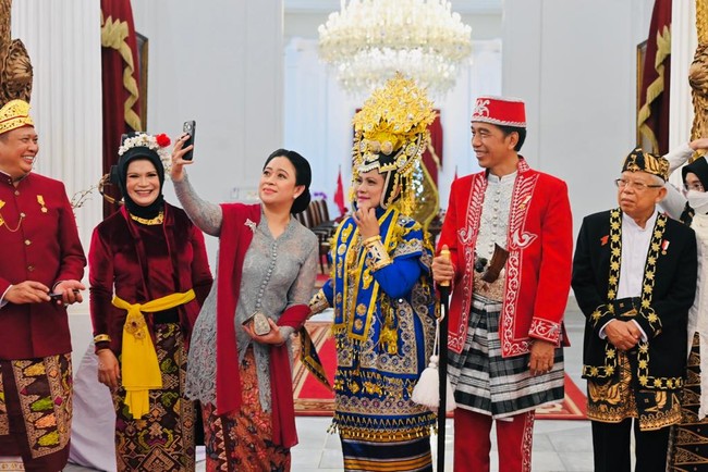 Selain itu, ada foto yang memperlihatkan kebersamaan Jokowi, Wapres Ma'ruf Amin, Puan dan Ketua MPR Bambang Soesatyo. Ada juga Ketua MK Anwar Usman dan istrinya, Idayati.