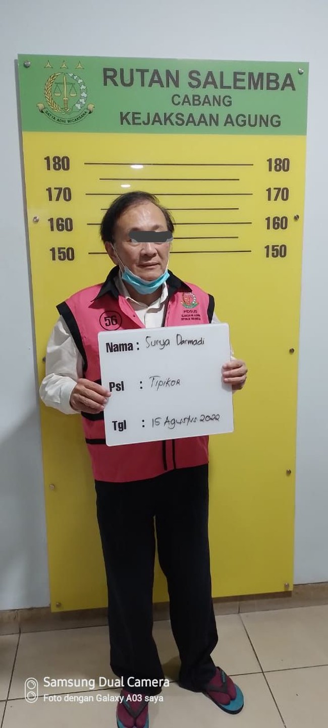 Di foto tersebut, Surya Darmadi memegang papan tulis berwarna putih tertulis namanya dan pasal yang dikenakan, yaitu pasal tindak pidana korupsi. Foto tersebut diambil pada 15 Agustus 2022.