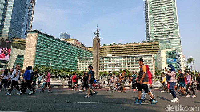 Pantauan detikcom pagi ini di kawasan Bundaran HI, Jakarta Pusat, Minggu (21/8/2022), terlihat masih ramai warga berolahraga. Mereka terlihat mengenakan masker saat melakukan aktivitas olahraga.