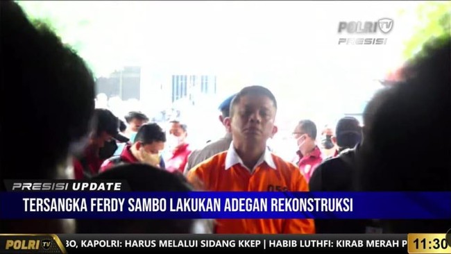 Irjen Ferdy Sambo dihadirkan dalam rekonstruksi kasus pembunuhan berencana Brigadir Yosua Hutabarat atau Brigadir J. Sambo memakai baju tahanan.