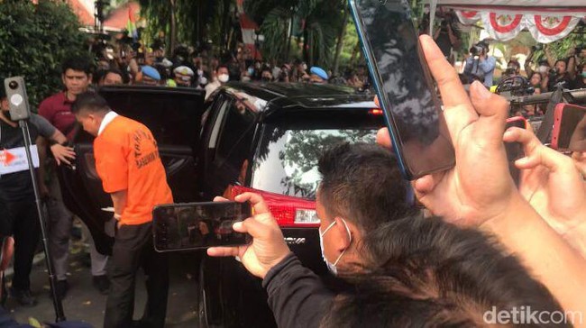 Berdasarkan pantauan detikcom, Selasa (30/8/2022), Sambo, yang mengenakan baju oranye tahanan, awalnya turun dari mobil. Sambo terlihat sudah memakai sarung tangan dan membawa pistol di saku.