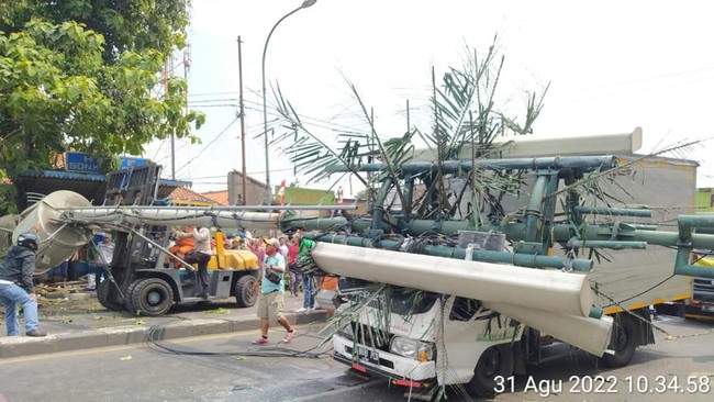 Foto kedua menunjukkan suasana di lokasi kecelakaan dari sudut lain. Sedangkan di foto ketiga, tampak truk trailer di dekat lokasi tiang. Ada beberapa barang yang tampak berserakan di dekat lokasi.