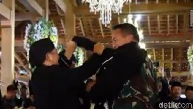 Secara simbolis, Moerdjoko memakaikan seragam kebesaran PSHT ke Jenderal Andika. Pengukuhan ini disambut tepuk tangan para pendekar, terdengar pula riuh yel-yel PSHT.