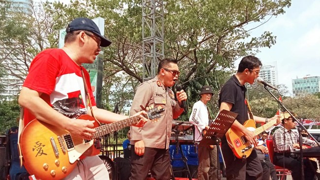 Pantauan detikcom di lokasi, Sabtu (3/9/2022) tampak Fadil Imran, yang mengenakan seragam lengkap, naik ke atas panggung. Di sana terlihat Fadil menyanyikan lagu 'Rumah Kita' dari grup musik legendaris Indonesia God Bless.
