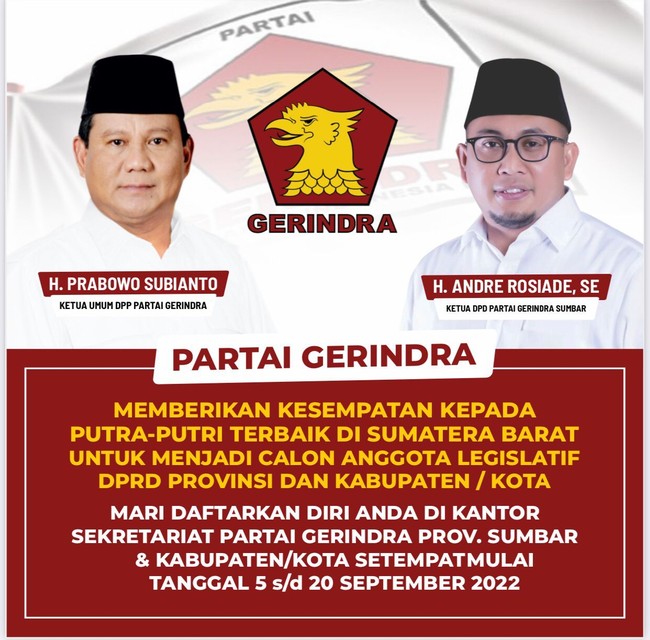 "Masyarakat Sumbar yang kami cintai, yang kami sayangi. Partai Gerindra saat ini memberikan kesempatan kepada putra-putri terbaik di Sumbar untuk menjadi calon anggota legislatif DPRD Provinsi Sumbar dan Kabupaten/Kota. Untuk itu, saya Andre Rosiade, Ketua DPD Gerindra Sumbar mengajak seluruh masyarakat," kata Andre dalam keterangan tertulis, Senin (5/9/2022).