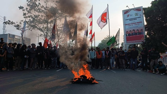 Demo mahasiswa Banten menolak kenaikan harga BBM menutup akses Jalan Syekh Nawawi Al Bantani depan gedung DPRD Banten. Mahasiswa juga membakar ban dan melakukan orasi.