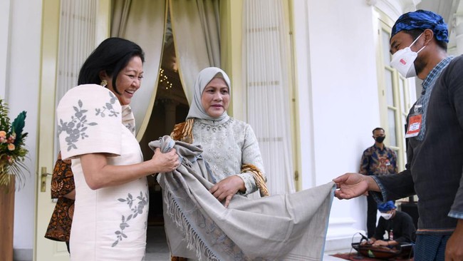 Pada kesempatan tersebut, Iriana menyerahkan kain tenun asli Badui sebagai kenang-kenangan untuk Louise.