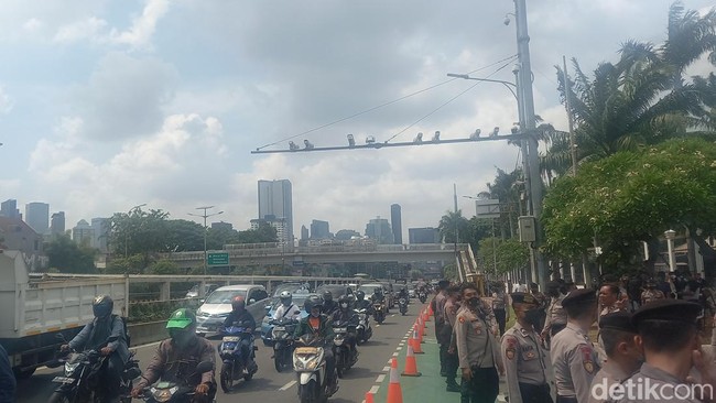 Massa demo yang terdiri atas berbagai elemen mulai hadir di depan gedung DPR/MPR RI. Akibatnya, lalu lintas di Jl Gatot Subroto yang tepat berada di depan gedung DPR RI tersendat.