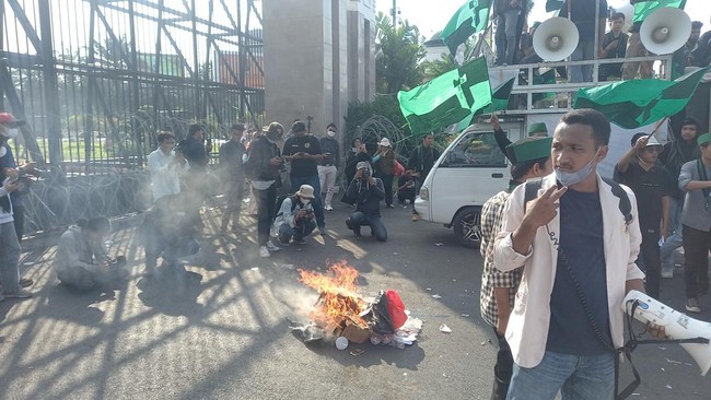 Massa mahasiswa yang berdemo terkait kenaikan harga BBM di depan DPR RI mulai melakukan aksi bakar-bakaran di depan gerbangnya. Selain itu, sejumlah massa emak-emak juga ikut demo dan berorasi.