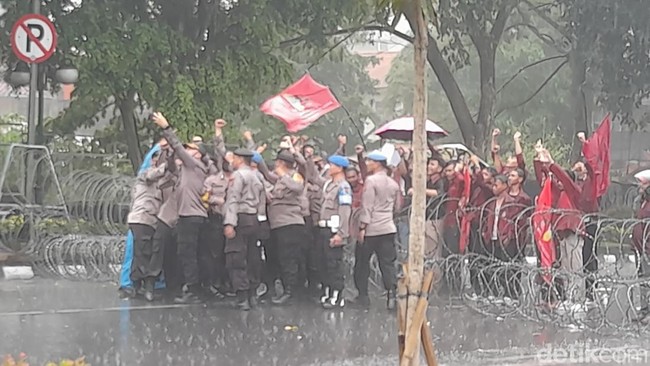 Begitu pun petugas kepolisian yang berjaga di depan massa demo dan dibatasi dengan pagar kawat berduri. Mereka tetap berjaga mengamankan jalannya aksi demo.