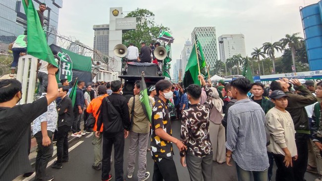 Massa BEM SI nampak berada di sisi sebelah kiri di Jl Medan Merdeka Barat. Sementara itu, di sisi kanan terdapat massa aksi dari GMNI.