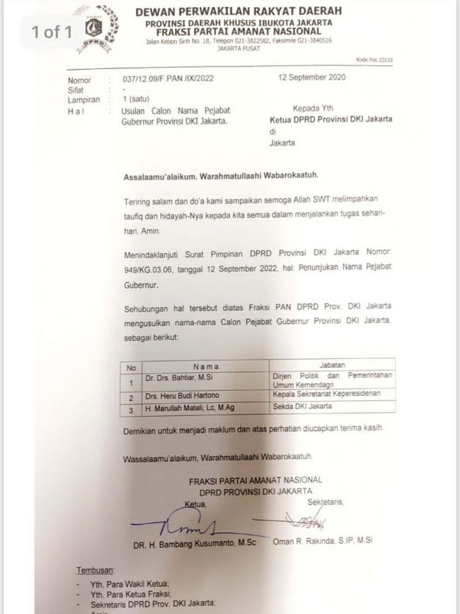 "Sehubungan hal tersebut di atas, Fraksi PAN DPRD Prov DKI Jakarta mengusulkan nama-nama calon Pejabat Gubernur Provinsi DKI Jakarta sebagai berikut," demikian isi surat yang dilihat.