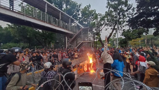 Pantauan detikcom insiden ini terjadi pada Selasa (13/9/2022) pukul 17.39 WIB. Massa mahasiswa tiba-tiba menarik kawat duri yang terpasang melintang di sekitar lokasi aksi.