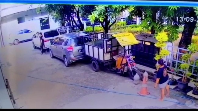 Pelaku terlihat mondar-mandir di ujung jalan. Setelahnya, pelaku mendekati korban dengan cara mengendap-endap bersembunyi di sela-sela mobil dan tembok.
