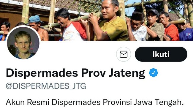 Nama akun itu juga berubah menjadi vitalik.eth. Foto profil juga terlihat berubah menjadi foto seorang pria. Sedangkan, di biodata nampak masih tertulis bila akun Twitter yang bercentang biru itu dikelola oleh Dispermadesdukcapil Jateng.