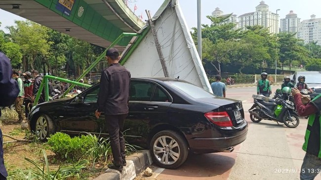 Mobil Mercy berwarna hitam menabrak baliho di Kemayoran, Jakarta Pusat (Jakpus), hingga roboh. Polisi menduga sopir kurang berkonsentrasi.