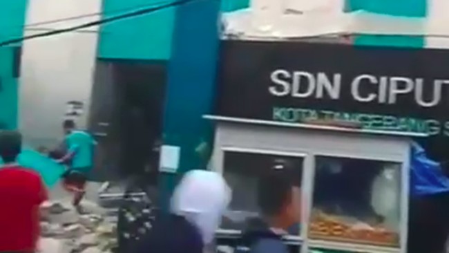 Dari video yang diterima detikcom, terlihat bangunan sekolah dicat berwarna biru dan putih roboh. Beberapa material bangunan tampak terlepas dan berserakan di tanah.