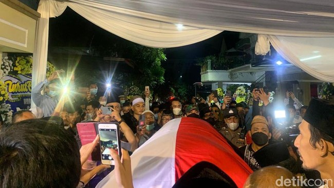 Pantauan detikcom di lokasi, Senin (19/9/2022), ambulans yang membawa jenazah Azyumardi Azra tiba di rumah duka di Ciputat, Tanggerang Selatan, pukul 23.53 WIB. Peti jenazah tampak dibalut dengan kain bendera merah putih.