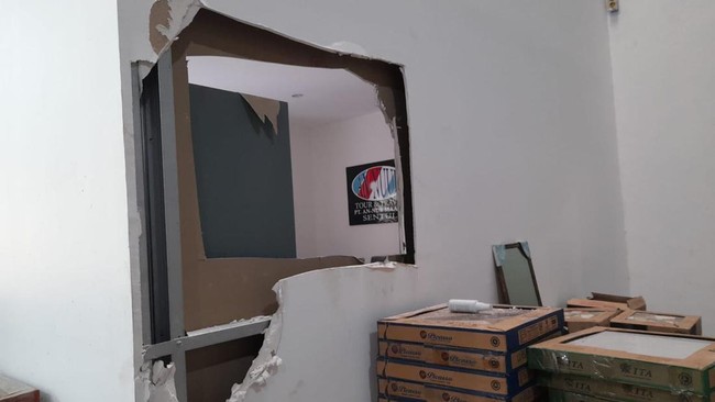 "Jadi mereka (pelaku) jebol dinding toko bangunan dulu, terus jebol lagi dinding kantor kita dari dalam toko bangunan. Tembok kita (kantor umrah) kan terbuat dari GRC gitu. Jadi ada dua tembok yang dijebolnya," bebernya.