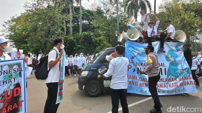Massa aksi yang tergabung dalam Dewan Pengurus Nasional Forum Komunikasi Nakes dan Non-Nakes Indonesia (DPN FKHN Indonesia) menggelar aksi di kawasan Patung Kuda, Jakarta Pusat. Mereka menuntut peraturan pemerintah khusus untuk pengangkatan honorer nakes dan non-nakes menjadi aparatur sipil negara (ASN).