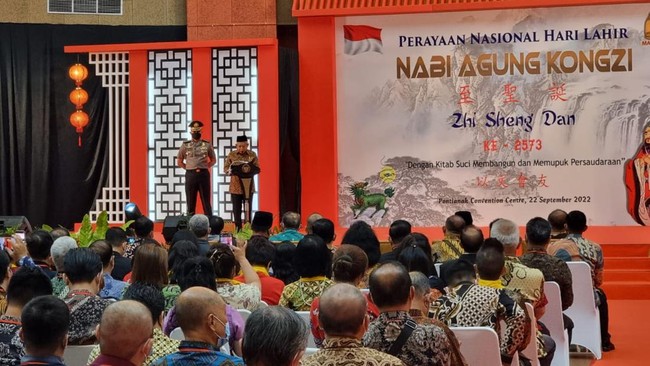 Ma'ruf menghadiri Perayaan Kelahiran Nabi Agung Kongzi (Konghucu) ke-2.573 di Pontianak Convention Centre, Kalbar, Kamis (22/9/2022). Mengawali sambutannya, Ma'ruf menyampaikan salam hangat dari Presiden Joko Widodo (Jokowi) untuk seluruh hadirin.