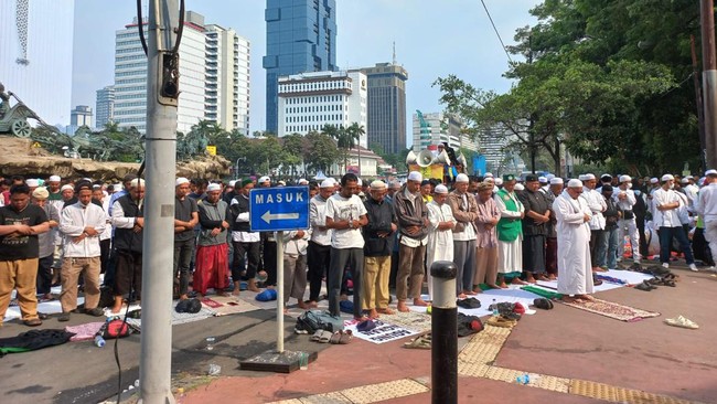 Pantauan detikcom di lokasi, Jumat (23/9/2022), pukul 15.06 WIB, orator mengimbau peserta massa aksi segera mengambil air wudu sebelum melaksanakan salat Asar berjemaah. Terlihat massa aksi membentangkan terpal di jalanan.