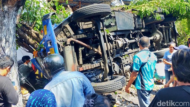 Sopir truk membanting stir ke arah kiri. Namun, kendaraan besar itu justru menerobos jalur kanan hingga menabrak 2 pengendara motor dan sebuah warung.