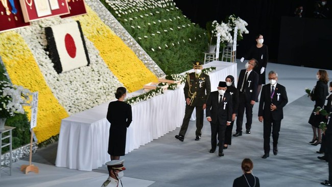 Wakil Presiden RI (Wapres) Ma'ruf Amin menghadiri prosesi pemakaman kenegaraan Mantan Perdana Menteri (PM) Jepang Shinzo Abe di Nippon Budokan, Choyoda, Tokyo hari ini. Ma'ruf menghadiri prosesi pemakaman itu dengan didampingi istrinya Wury Ma'ruf Amin.