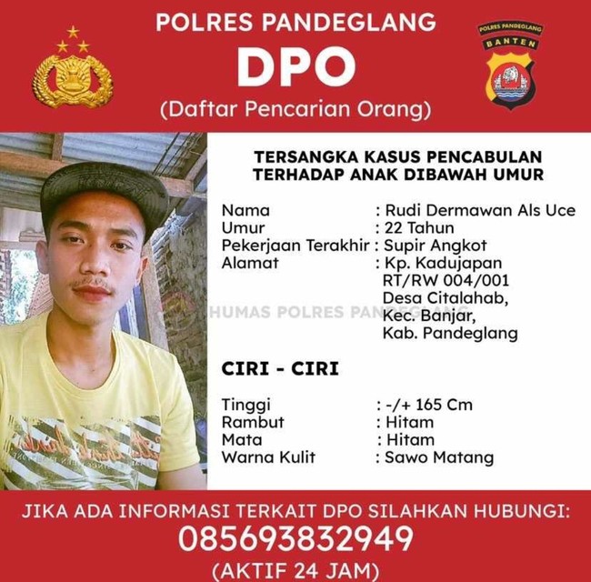 "Udah ditetapkan tersangka, setelah ditetapkan tersangka diterbitkan lah DPO-nya dan SPDP (Surat pemberitahuan dimulainya penyidikan) telah dikirim ke kejaksaan," kata Kanit PPA Satreskrim Polres Pandeglang Ipda Akbar, Rabu (28/9/2022).