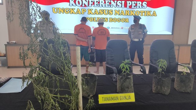 "Saat ini Satresnarkoba Polres Bogor sedang melakukan penyidikan terhadap dua orang tersangka yang melakukan penyalahgunaan narkotika dengan cara menanam narkotika jenis tanaman ganja. Yang dilakukan oleh Tersangka adalah pada saat Tersangka memperoleh ganja, kemudian bijinya oleh yang bersangkutan ditanam," kata Kapolres Bogor AKBP Iman Imanuddin kepada wartawan saat konferensi pers di Mapolres Bogor, Kamis (29/9/2022).