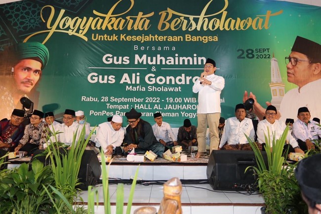 Ketua Umum Partai Kebangkitan Bangsa (PKB) Abdul Muhaimin Iskandar mengikuti acara Yogyakarta Berselawat bersama Gus Ali Gondrong di Ponpes Sunan Pandanaran, Sleman, Rabu (28/9). Bersama para mafia selawat (Mafis), santri dan masyarakat DIY, Gus Muhaimin mendoakan keselamatan untuk Indonesia dan dunia.