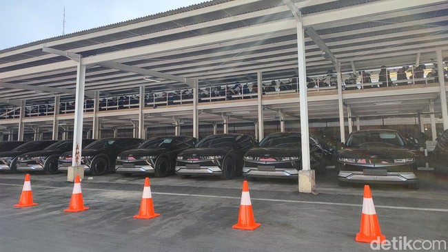 Pantauan detikcom di lokasi, Jumat (30/9/2022), mobil listrik itu terparkir tanpa nomor pelat. Seluruh mobil tersebut tampak terlihat baru. Mobil itu dibatasi dengan traffic cone.