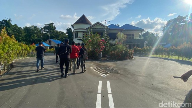Dari gerbang tersebut, masih perlu menempuh perjalanan sekitar 200 meter untuk sampai ke bangunan utama rumah Lukas Enembe. Di lokasi terlihat ada sejumlah kerabat sedang berbincang dengan Lukas Enembe.