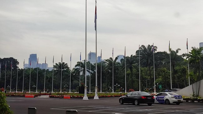 Sementara itu, di area depan Gedung Kura-Kura, terlihat bendera dari sejumlah negara berkibar.