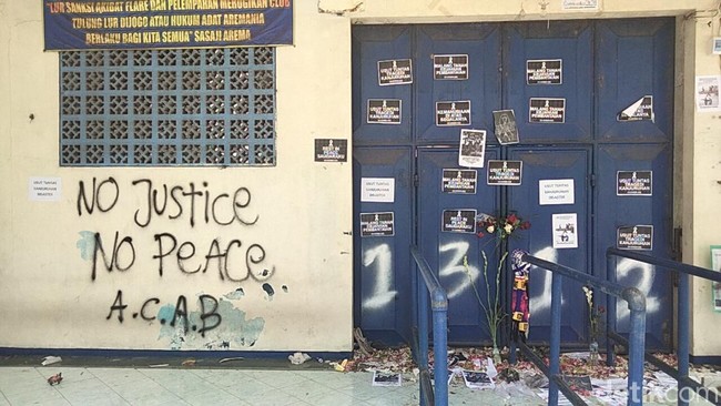 Seperti dilihat, nampak banyak coretan dengan tulisan "No Justice No Peace A.C.A.B", "1.3.1.2", "Rest in Peace Saudaraku" hingga "Usut Tuntas Tragedi Kanjuruhan" yang bersandingan dengan kode 1312 dan ACAB mewarnai tembok Stadion Kanjuruhan, Malang.